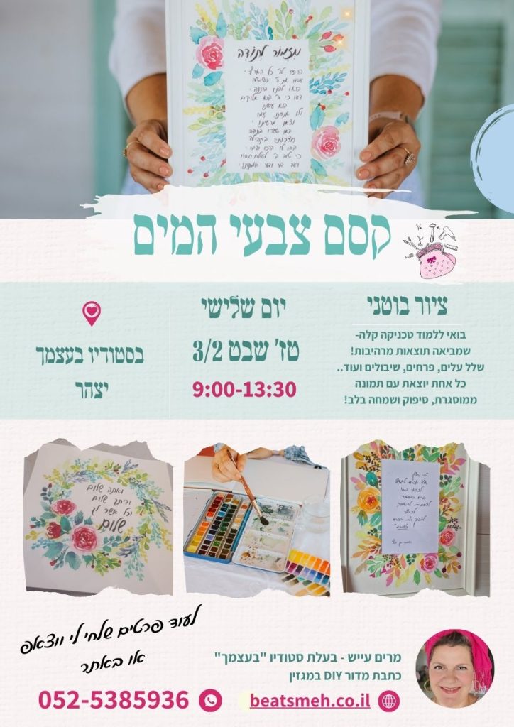 ארבע וחצי שעות של הנאה צרופה במהלכן נתנסה בצבעי מים, נלמד טכניקה קלה- שמביאה לתוצאות מרהיבות!